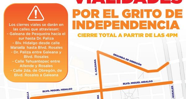En ese sentido, se tiene que las autoridades de tránsito y organizadores del evento del Grito de Independencia a partir de las cuatro de la tarde de este viernes se presenta el cierre total de las vialidades aledañas al Centro Histórico sobre el bulevar Hidalgo desde la calle Marsella hasta la Rosales y de la Pesqueira a la Tehuantepec.