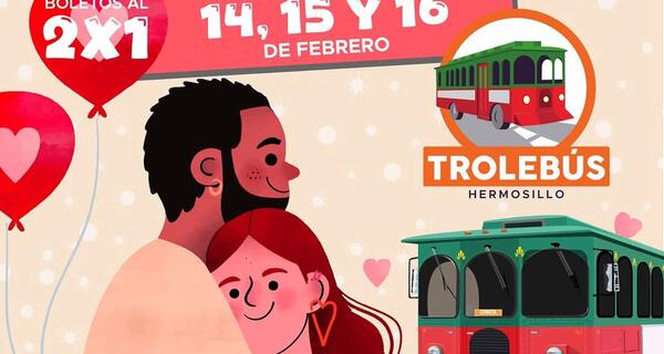 Este viernes 14, sábado 15 y domingo 16 de febrero adquiere tus boletos de Trolebús al 2x1 con la promoción del Día del Amor y la Amistad que el Ayuntamiento de Hermosillo ofrece para quienes deseen recorrer los lugares emblemáticos del municipio.